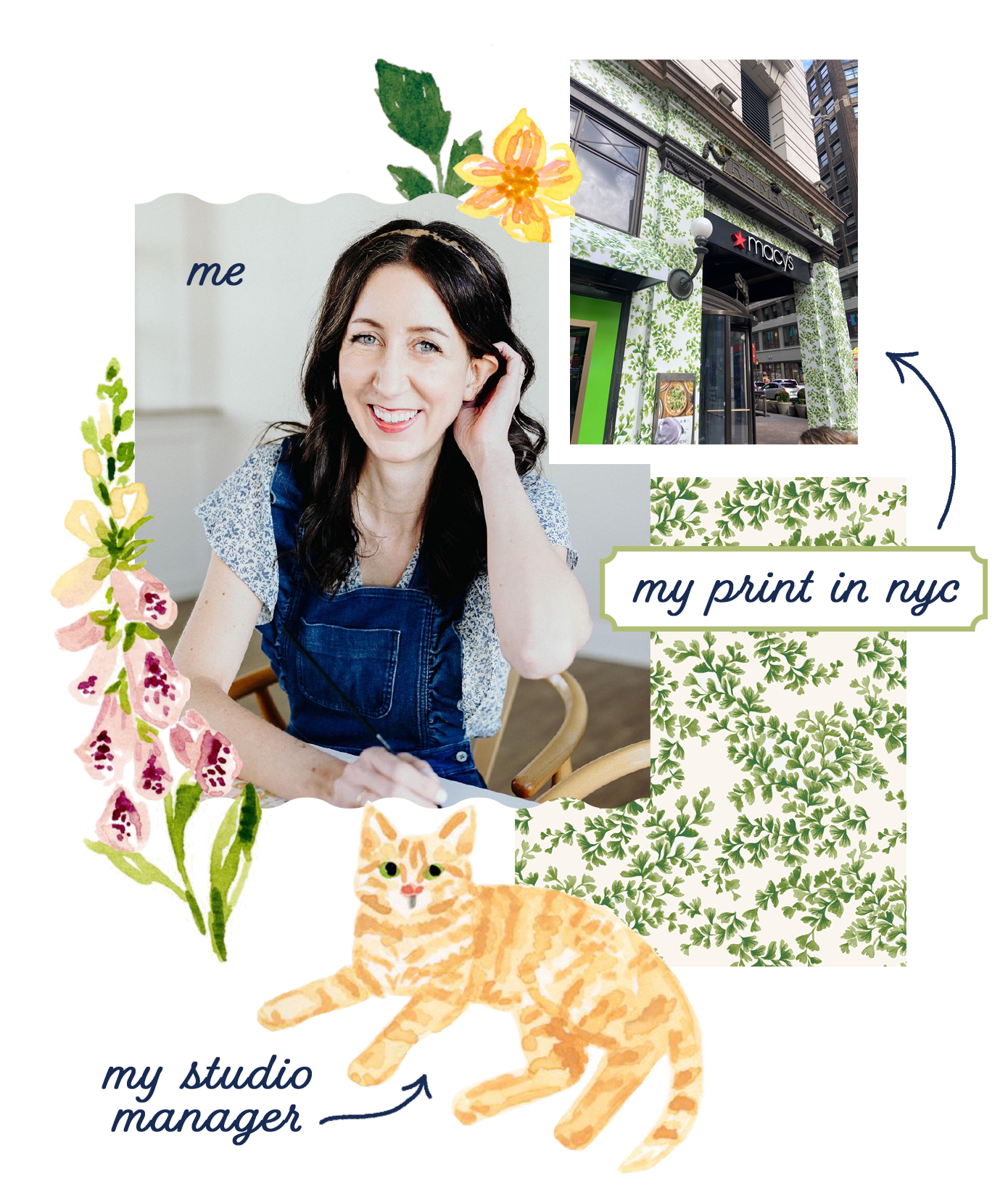 I’m passionate about flowers, maximalism and anything vintage. When I’m not in the studio you’ll find me out in the garden, strolling around Philadelphia or catering to the whims of my studio manager (a 17-year-old grouchy orange tabby named Buttons).
